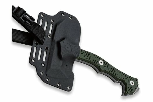 The knives from DJ Urbanovsky represent the successful synthesis of an exciting and entirely unique design, while at all times also featuring pronounced functionality. His first tomahawk is primarily characterized by its extreme compactness. At an overall length of barely 23 cm, the Chicken Hawk is significantly more versatile in terms of transportation and carrying options than a classically proportioned hawk. The included kydex sheath along with the also included belt cannot only be carried on the belt or the gear but also under the armpit. The ergonomically shaped handle not only supports classic hacking, but also permits a securely chocked grip for detailed work, be it for whittling, scraping or cutting. For maximum effectiveness, the axe head is also dressed along the top edge all the way to the eye. 6.3 mm thick 440C and high-strength G-10 scale make the Chicken Hawk into an essentially indestructible tactical tool. The concept is rounded out by the impact element formed on the pommel.