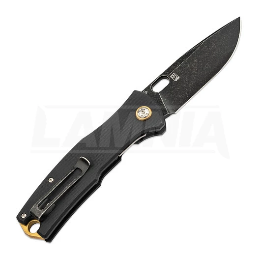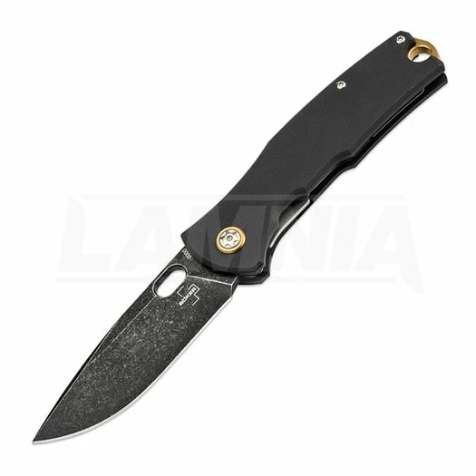 The Boker Plus Fieldfolder designed by Jesper Voxnaes masters all cutting tasks effortlessly and convinces in everyday life as well as in use. The reliable pocket knife is supplied with a dark stonewash blade made of D2, which is operated by a thumb hole and secured by a sturdy linerlock. The liners recessed into the impressive textured black G10 handle scales are made of stainless steel, while the partially exposed spacer is made of brass. A likewise brass-coloured ring around the decorative pivot screw adds an additional visual accent. Jimpings around the thumb rest and at the end of the handle increase safety at work. With lanyard hole, deep-carry clip (tip-up/r) and high-quality nylon pouch for storage.