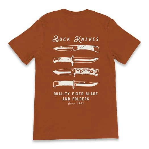 Small Buck logo on front chest. Quality blades artwork on back. Lightweight. Regular fit. Color: Copper. Cotton construction. Size: X-Large.