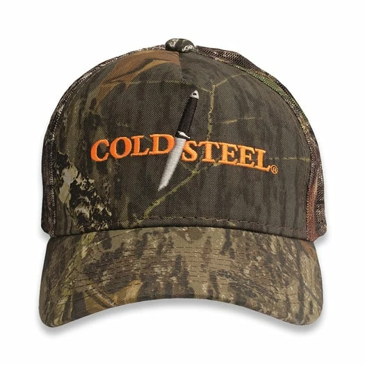 Official Mossy Oak licensed product. Nylon mesh back. Adjustable Velcro closure. 5-panel structured construction. Brushed cotton with polyester twill front. Orange Cold Steel logo embroidered on front.