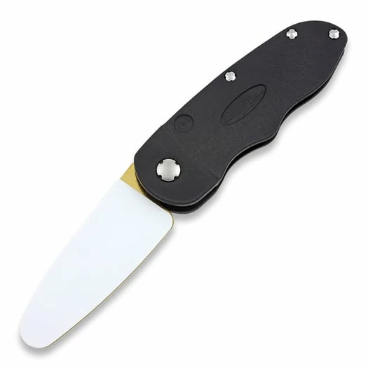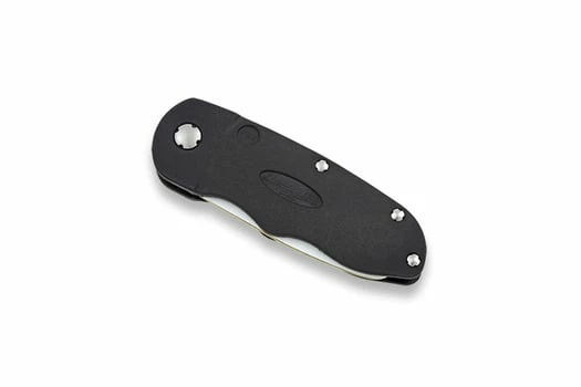 3″ tapered double sided Ceramic 1 micron grit and Diamond 25 micron grit stone. Smooth, flat surface allows for easy sharpening. Uses no oil or water. Stone folds into 4 3/8″ black Zytel handle for convenient storage when not in use. Depress button lock to flip the stone out of the handle. In the open or closed position the sharpener resembles a pocket knife. Hang packaged.