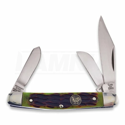 Closed: 3.25″; Blade: Stainless l Standard Edge l Mirror Polish Finish; Other Info: Nickel Silver Bolsters l Inlay Shield. Clip, sheepfoot, and pen blades. Bone handles.