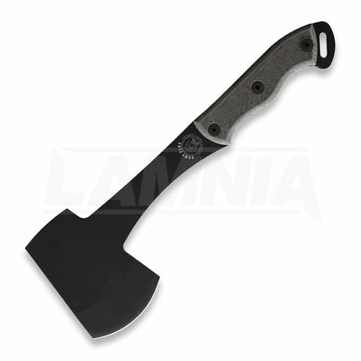 305 mm overall. 108 mm black powder coated carbon steel axe head with 76 mm cutting edge. Gray canvas micarta handle. Full, extended tang. Lanyard hole. Brown leather belt sheath.