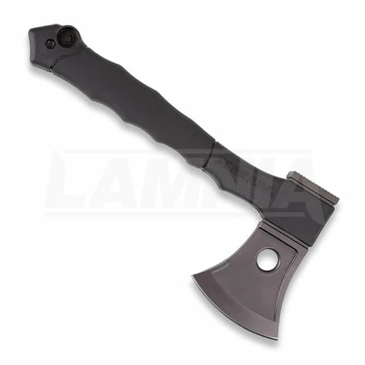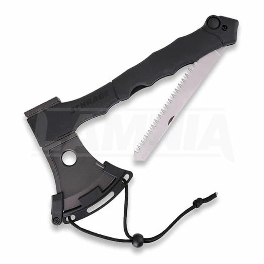 13″ overall. 5.5″ black finish stainless axe head with 3.5″ cutting edge. Black finger grooved rubber handle. 7″ saw blade folds into handle.